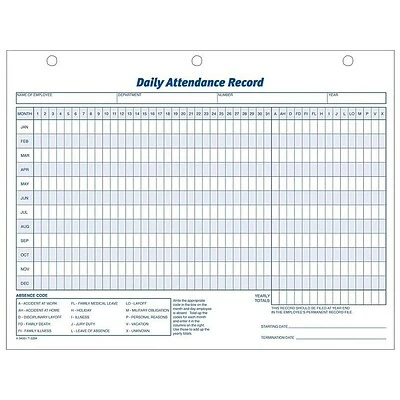 Keep track of vacation time, PTO and sick days with these attendance records. The letter-size prepunched sheets fit neatly in binders or personnel folders, while the preprinted forms make it easy to enter information about each missed day of work. A 12-month layout provides space for a whole year’s worth of attendance. With an absence code key, these Adams daily attendance records offer a simple way to designate time off.