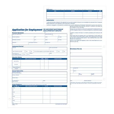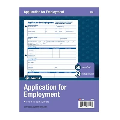 Make applying for employment simple by using these letter-size employment application forms. Each one is printed in English for convenience, while the three-hole-punched edge lets you conveniently insert them into any standard three-ring binder. These Adams employment application forms comply with all legal requirements and have 50 sheets per pad, so stocking up is easy.