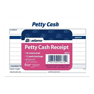 Refer back to past payments easily with this receipt book. With a gummed left side, this book makes it easy to keep papers secure while not in use, and preprinted spaces for a date, total, description and other notes help provide accurate, clear documentation. This Adams one-part petty-cash receipt book comes with 50 sheets per pad and can be used for various transaction types.