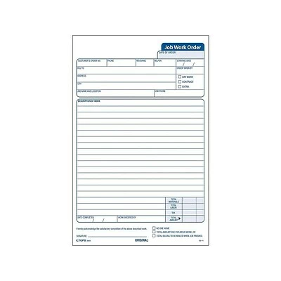 Provide accurate descriptions with these three-part work-order forms. Highlighted areas for order dates, job descriptions, and other categories help keep things organized and easy to read, and the extra space for material and labor prices helps track the amount spent on projects. These TOPS carbonless Job work-order forms come with 50 in a pack for easy stocking and feature a white, canary, and white-tag sequence for simple duplication.