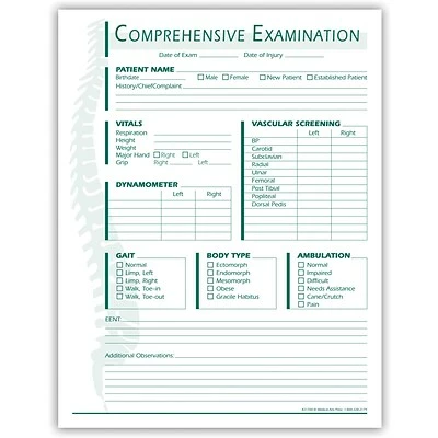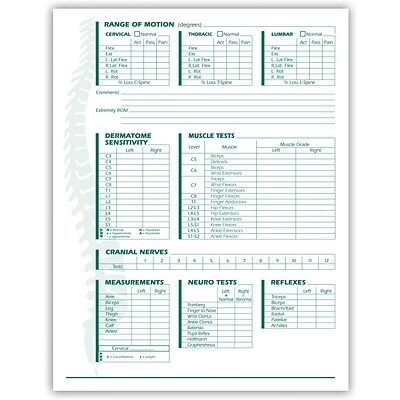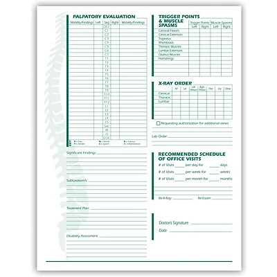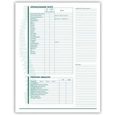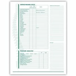 4-page document records clinical detail from a patient’s comprehensive exam. Includes sections to record results from clinical tests. Includes top 25 ortho/neuro tests. Summation content section. 250 per pack. 11×17″ overall; 8-1/2×11″ folded.