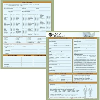 Comprehensive color forms include areas for complete registration and history information, reason for visit, type of pain, site of pain or numbness