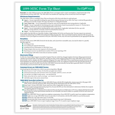 Tax Form Kit includes: 4-Part 1099 laser forms, self-seal double window envelopes, transmittal forms (3) and tip sheet with guidelines on minimum requirements, penalties and common errors.
