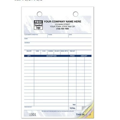 Preprinted areas simplify write-ups of customer information, salesperson, description of items, payment method & more