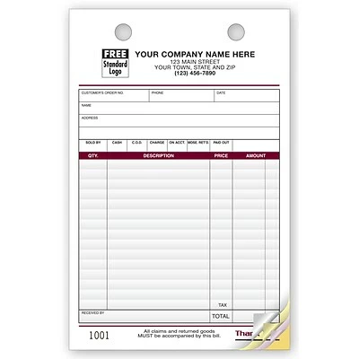 Preprinted areas simplify write-ups of customer information, salesperson, description of items, payment method & more