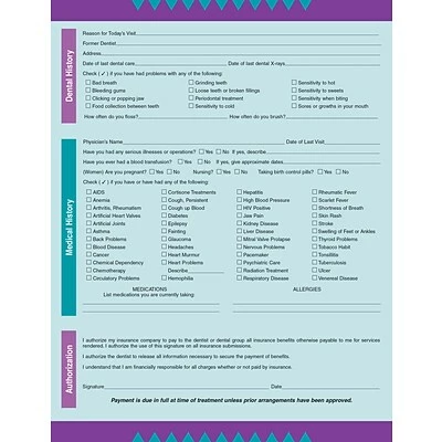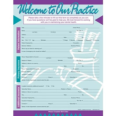 Sets a friendly welcome tone for new patients. Gathers complete personal information, dental history and insurance information plus assignment and release for account setup. Printed both sides on 24-lb. bond. 250 forms per package. Size: 8-1/2×11″.