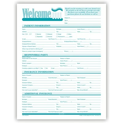 Gathers complete personal information, dental history and insurance information plus assignment and release for account setup