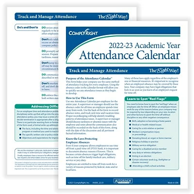 The efficient calendar format of the ComplyRight Academic Year Attendance Calendar™ (August 1 – July 31) and easy coding system make tracking absences quick and convenient. The reverse side of the cards includes plenty of space to record notes and warnings. This pack of 50 includes ComplyRight tips for optimal use.