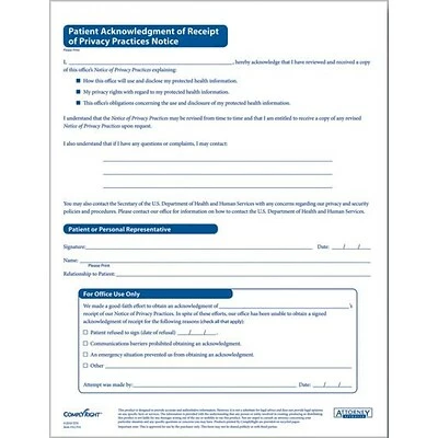 ComplyRight Patient acknowledgment of receipt of privacy practices notice is attorney approved form acknowledging patient’s information to be released to an authorized third party. Notice measures 8 1/2″ x 11″.