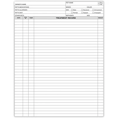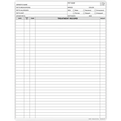 All-purpose form to document on-going notes for quick reference. Identifying information for each animal includes medications and allergies. Treatment notes for date, problem number, temperature and weight. Printed same both sides. Package of 250. Printed on 24-lb. white stock. Size: 8-1/2×11″.