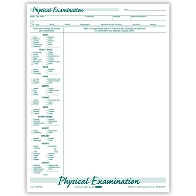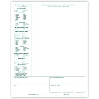 Has body systems check-off, vital signs, summary, treatment plan and signature sections. Helps you conform to NCQA & JCAHO guidelines. Printed both sides in teal ink on white 24-lb. paper. In packages of 250. Form size: 8-1/2×11″.