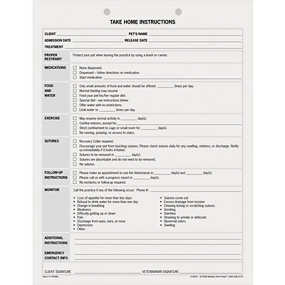 These Take Home Instructions give your clients specific details on how to care for their pet at home. This 2-part form is printed on carbonless paper for instant copying. Ideal for providing one copy to your client and keeping one for your records. Size: 8-1/2″ x 11″. 125 sheets per pack.