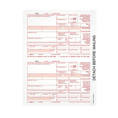 Satisfy IRS Tax requirements with TOPS 1099-R Distributions From Pensions, Annuities, etc. Forms – Federal Copy A cut sheet forms – 2 forms/sheet. Laser/inkjet printer compatible. Size: 8-1/2″ x 11″. Printed in scannable red ink.