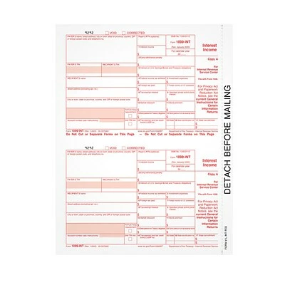 Satisfy IRS Tax requirements with TOPS 1099-INT Interest Income – Federal Copy A cut sheet forms – 2 forms/sheet. Laser/inkjet printer compatible. Size: 8-1/2″ x 11″. Printed in scannable red ink.