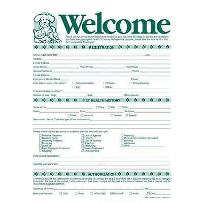 Sections include health history, current symptom/problem, vaccination record, medications and diet information