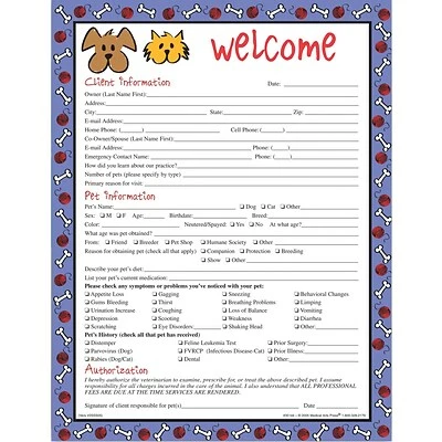 Appealing full-color forms with client-pleasing, pet-oriented designs extend a warm and friendly welcome