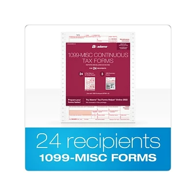 Get the Adams 2022 1099-MISC form on continuous feed paper for pin-fed dot matrix printers. This Adams tax pack includes 24 five-part 1099-MISC and three 1096 forms.