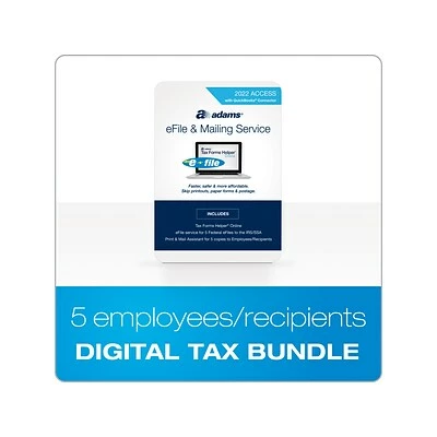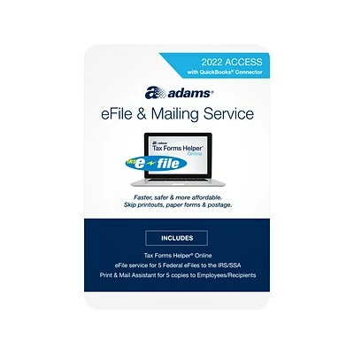 This Staples exclusive includes access to Adams Tax Forms Helper Online for 2022, e-file service for five federal e-files to the IRS/SSA, and Print & Mail Assistant for five copies to employees/recipients – a perfect all-in-one solution! Skip printouts, paper forms, and postage with the Adams eFile & Mailing Service 2022, the quick, easy, and safe way to e-file. Prepare and e-file up to five W-2, 1099-MISC, 1099-NEC or 1098 forms, and let the Print & Mail Assistant handle the mailing for up to five employees/recipients. With the Print & Mail Assistant, your tax data is transmitted to a secure mail facility, and copies for your employees/recipients are printed and sent by First-Class Mail. If you need more than five, you can purchase additional e-files and mailings in the Tax Forms Helper Online. Simply peel the paper strip from the back of your card to reveal your access code and get started.